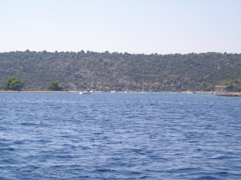 A large cargo ship passes us about a mile to port. For the rest the sea is empty. It remains empty during the next hours, while we steadily cover the miles between Vis and Šolta. Around ten o’clock we pass Šolta, and half an hour later we drop our anchor in the western arm of Uvala Solinska, a bay on the southside of the island Veli Drvenik. This is a beautiful bay, not too big, and very suitable for swimming. You can anchor deep in the bay. The water is crystal clear, you see the bottom, and there are lots of fish swimming around. We swim and snorkel around the bay and take a nap after our early start this morning. Then we have a big lunch. As usual during the last week, the winds dies down around noon. Since there is not much to do in the open, the conditions are excellent for a long break.
